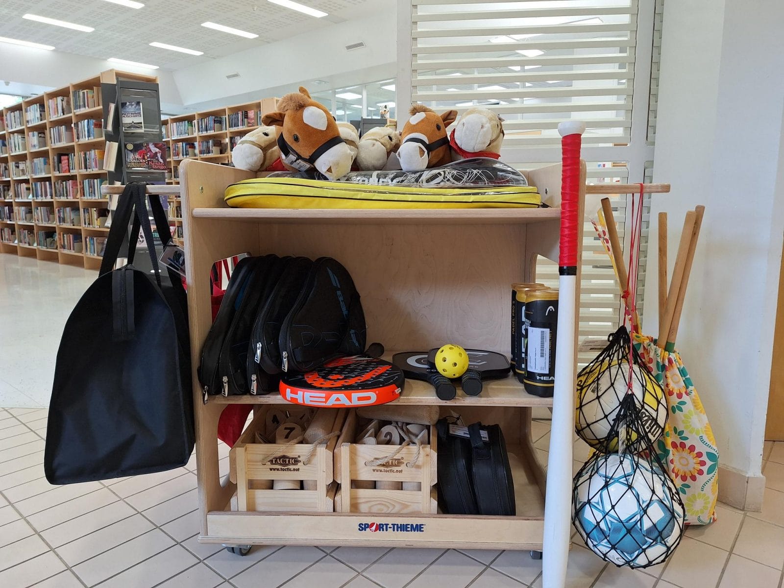 Kirjastossa sijaitsevasta liikuntavälinekärrystä voi lainata liikuntavälineitä kirjastokortilla. Liikuntavälineitä voi lainata myös kirjaston omatoimiaikana. Liikuntavälinelainaus on toteutettu Lopen liikuntatoimen ja Lopen kirjaston yhteistyönä.