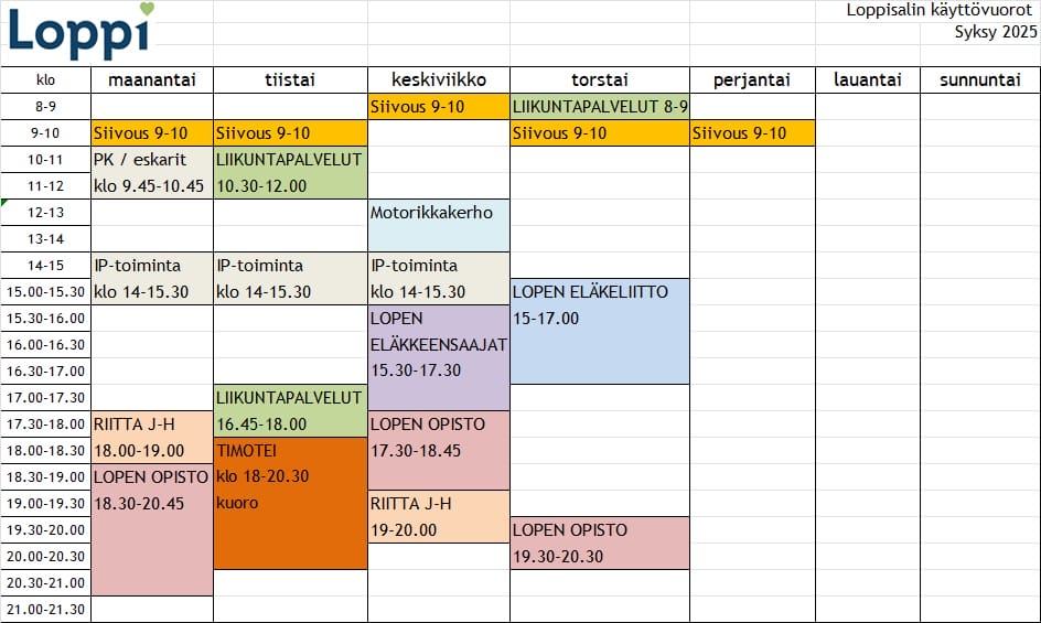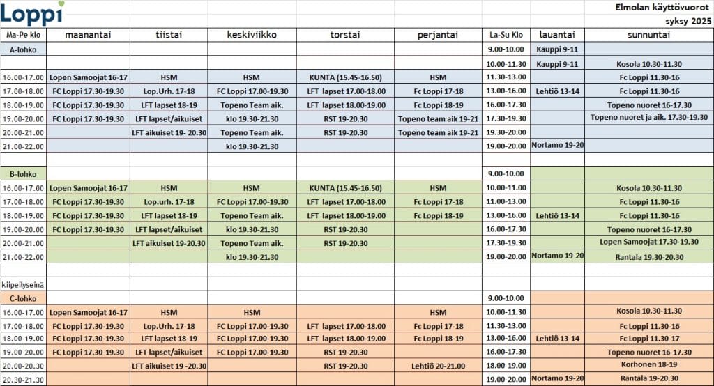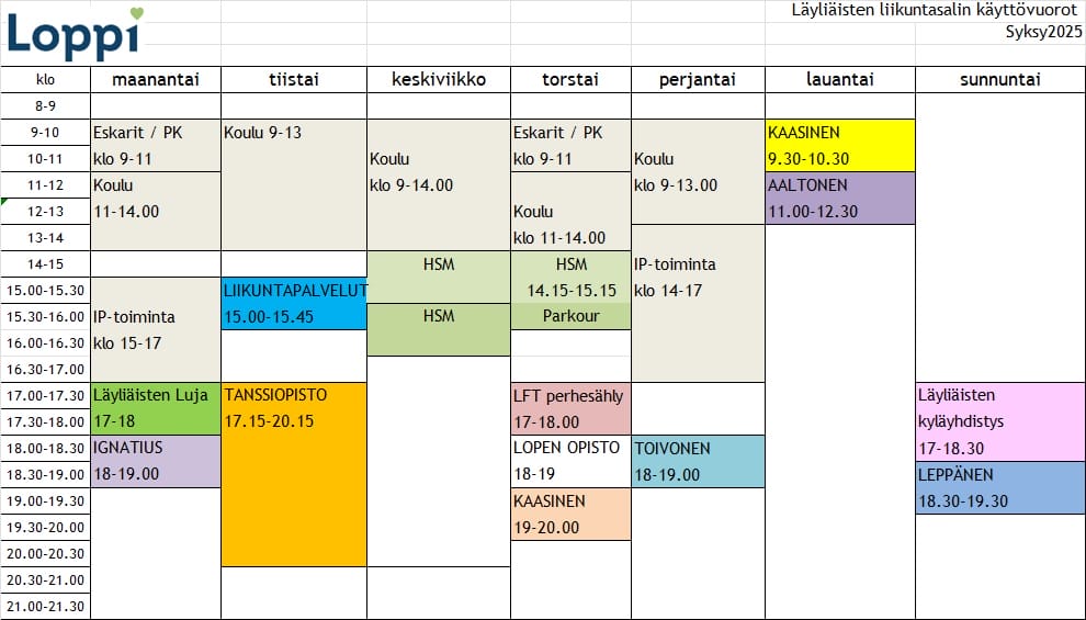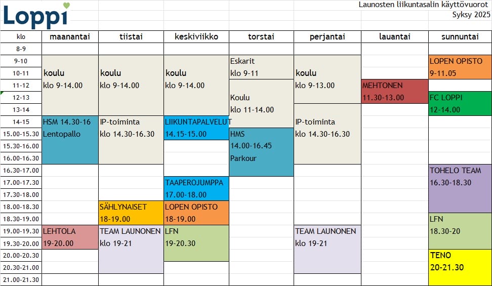 Kaudelle 2025-2026 (syksy 2025-kevät 2026) salivuoroja voi tiedutella: mira.sydanmaa@loppi.fi