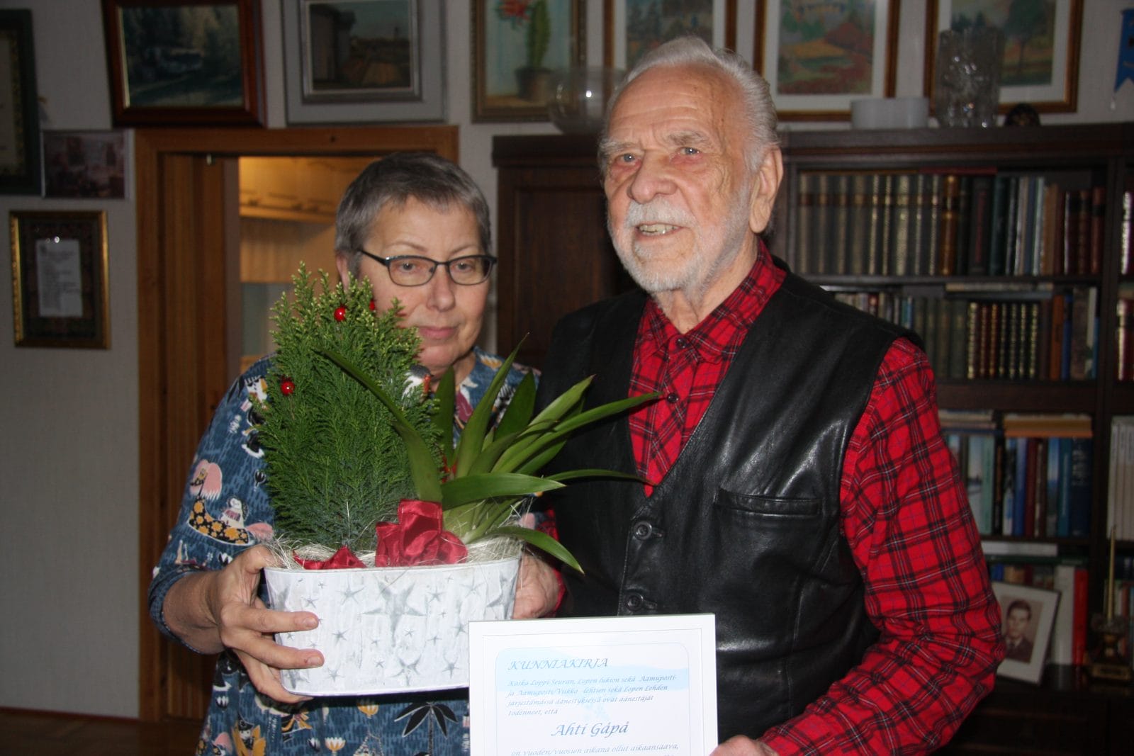 Ahti Gåpå sai kunniakirjan ja kukkatervehdyksen kulttuurituottaja Tuula Piriseltä.