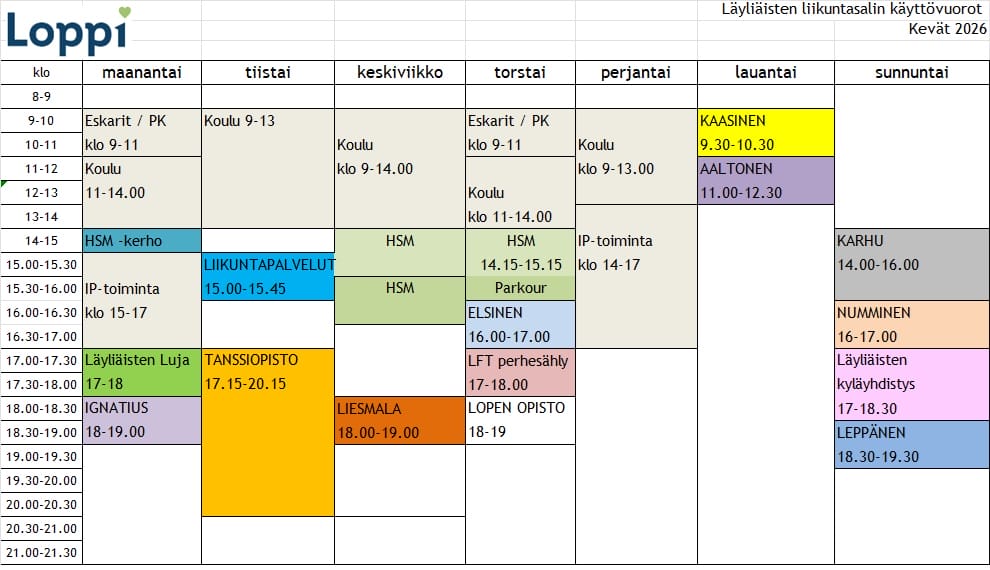 12700 LoppiViikonloput on varattu tapahtumille ja tilaisuuksille (ei vakiovuoroja). Tiedustelut ja vuorovaraukset liikuntapalveluista: