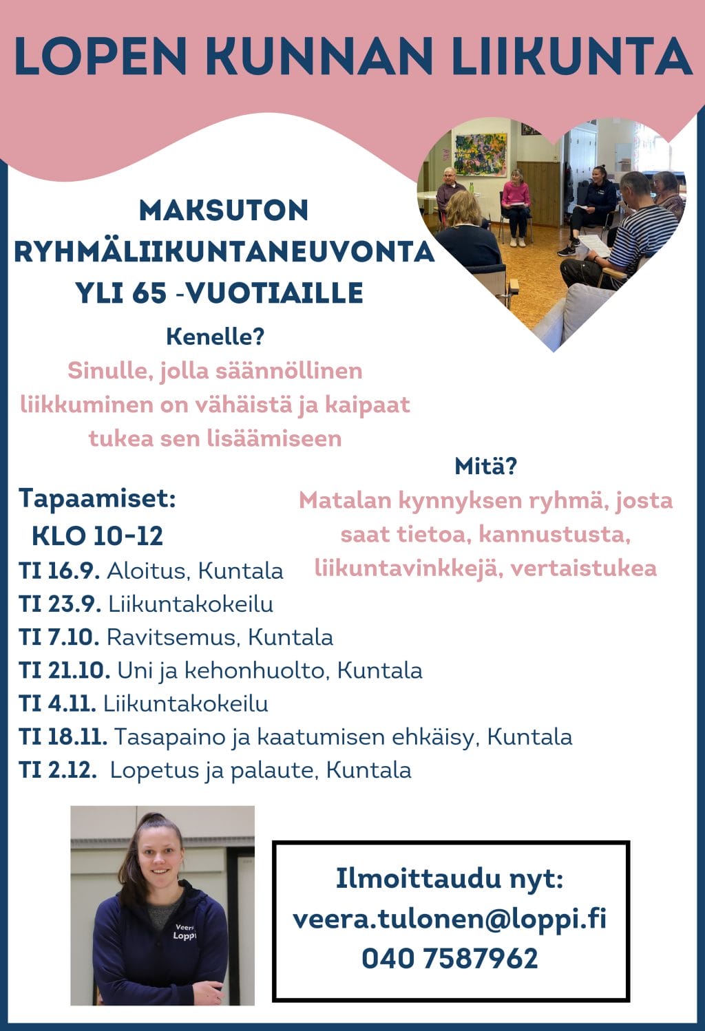 Ilmoittaudu mukaan ottamalla yhteys Veeraan sähköpostilla tai soittamalla