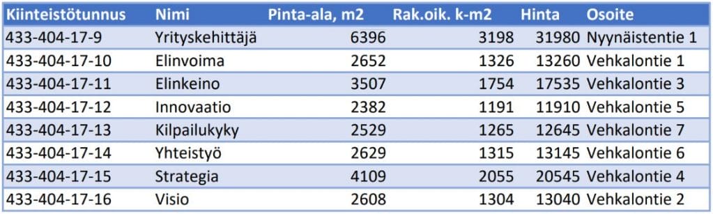 Tonttien ohjeellinen koko vaihtelee noin 2 382– 6 396 m². Tonttikokoa ja -jakoa voidaan tarvittaessa muuttaa. Tonttien tehokkuusluku 0,50. Hinnat 5 eur/m2.