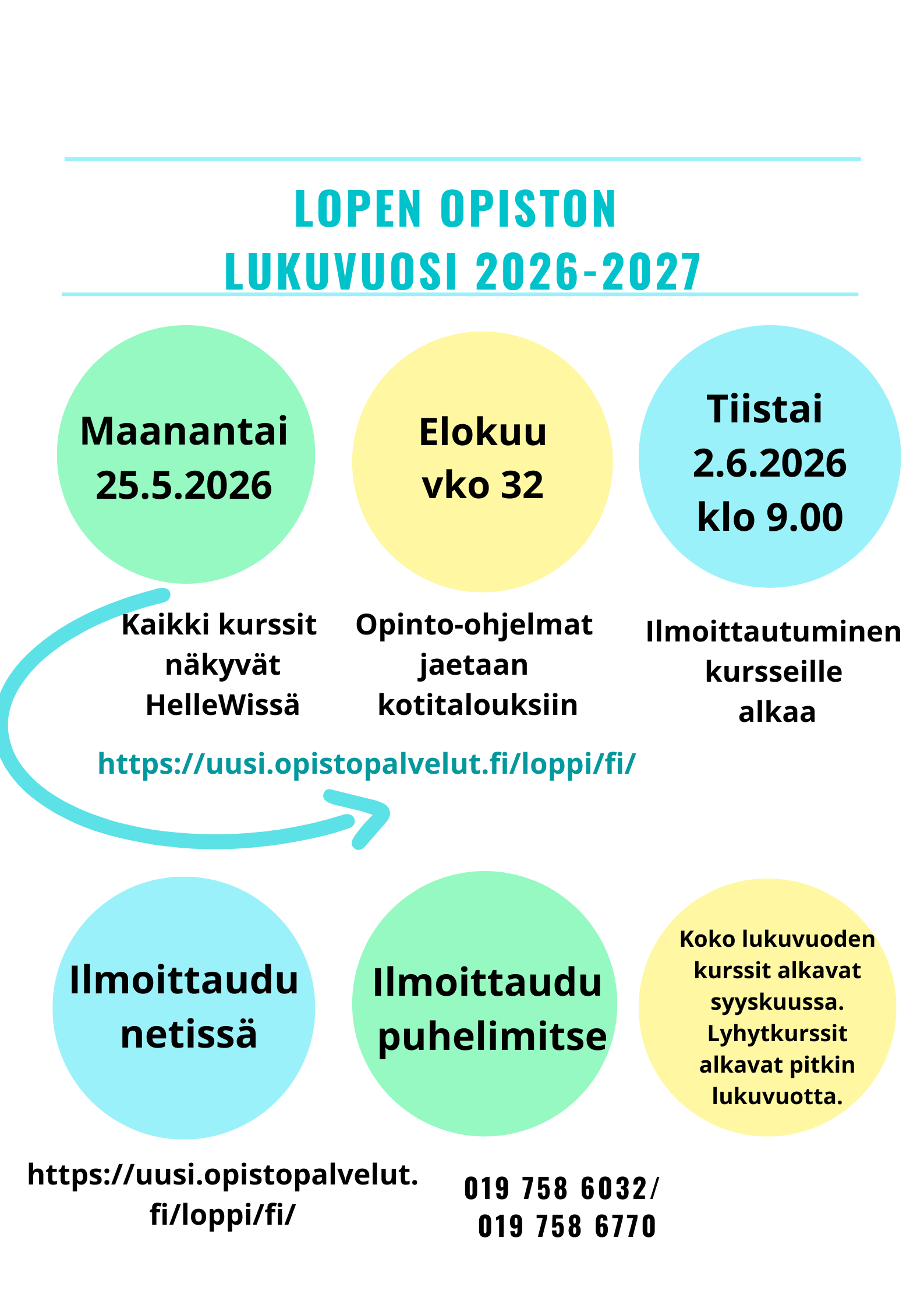 Jos et, ota yhteys Lopen opistoon toimistoon joko soittamalla p. 019 758 6032 (opistosihteeri) tai 019 758 6770 (rehtori).