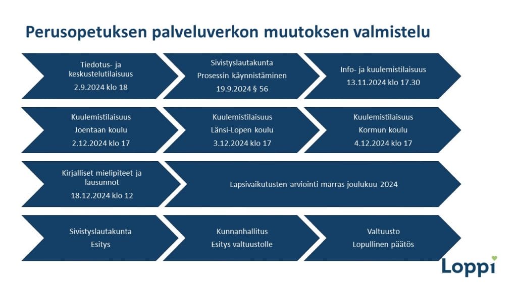 Lopen kunnassa on käynnistetty perusopetuksen palveluverkon muutoksen valmistelu. Sivistyslautakunta päätti kokouksessaan 19.9.2024 (§ 56), että perusopetuksen palveluverkon muutoksen valmistelu käynnistetään seuraavalla aikataululla: